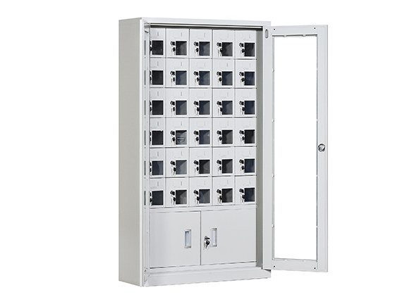 手機保密柜正面為對開金屬邊框玻璃大門,便于觀察柜內(nèi)情況,堅固透亮,美觀大方。