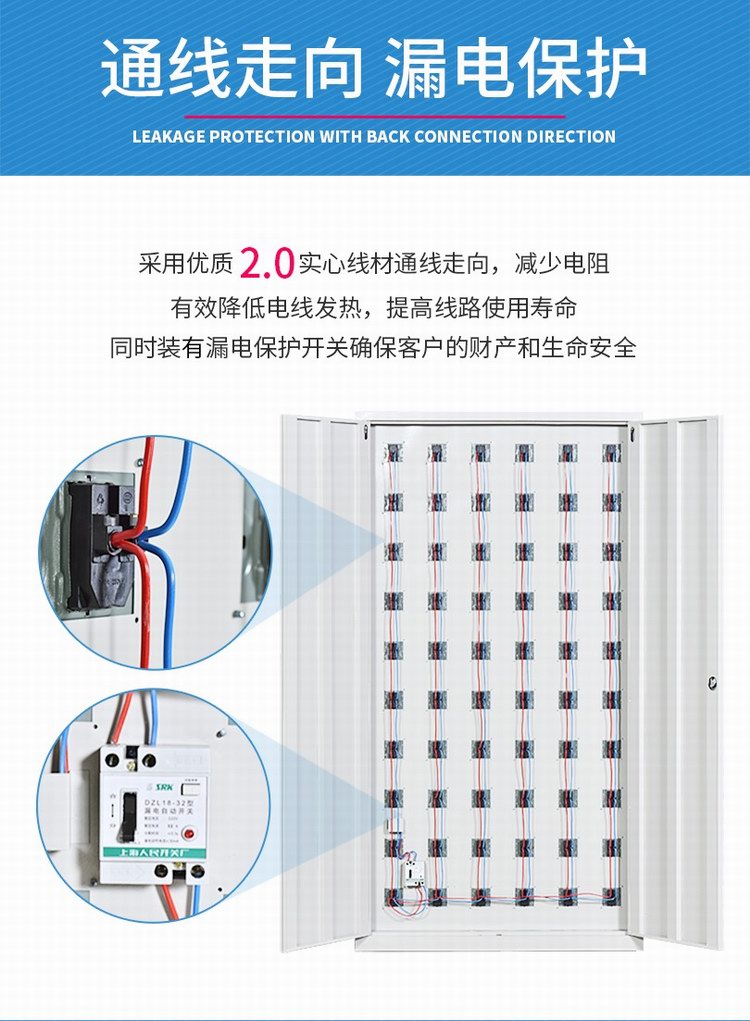 充電柜配備:2.5mm2實心線材,漏電保護器,小門內(nèi)配86型五孔插座(插座可選裝五孔+usb插座、多功能插座)